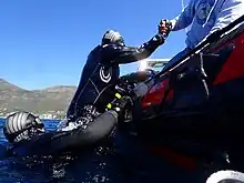 Getting into the water is usually done by a synchronised backward roll – falling into the water alongside your neighbour, neither on top nor underneath. Generally all the divers or a nominated group will roll off together, on a countdown from the skipper or divemaster. It is important to all roll together, as if you do not, the later divers may fall on top of the earlier ones, possibly casing injury or equipment damage. If you are not ready, or are not happy with this procedure, wait until the others are in and the boat is clear of them. The skipper will then let you roll in clear of the others, but you may have to fin a bit to get to them. This can be a problem if diving in a current. Some divers may not wish to backward roll with a large camera setup. They can ask the skipper to pass the camera to them when in the water. In this case they should stay close to the boat and preferably hold onto it until their camera is passed down.
