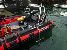 Rule 1: Do not take off your fins in the water unless there is a ladder. You need them to boost you up. Most rubber ducks do not provide a boarding ladder. This is even more important if you are boarding on the upwind side of the boat, as the boat will almost always drift downwind faster than a diver. Approach the boat and get a grip on the outer hand-rope. Try to retain a grip on the boat at all times, and let go only for as long as absolutely necessary to remove kit, as the boat may drift away while you are not holding on.