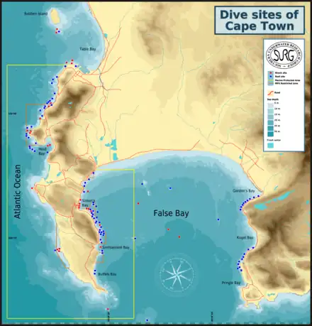 Detailed information on individual dive sites is provided in the sub-articles linked from the list of dive sites of the Cape Peninsula and False Bay. The information in the site descriptions ranges from superficial to highly detailed, depending on what is known about the site, and there may be a map. The bathymetric charts by SURGMAP are updated as and when new survey data is collected, and are mapped by swimming the contours towing a GPS buoy. They are reasonably accurate – within a couple of metres usually – and reliable for what is shown, but seldom complete. It is quite possible that some tall pinnacles have been missed. There is no guarantee that you will not discover one by hitting it with your boat. If you do, please let us know. Where bathymetric maps by Wreckless Marine are provided, they are more accurate, detailed, and precise, but are not easy to read as the scale is not given. They give an excellent idea of the general underwater topography.