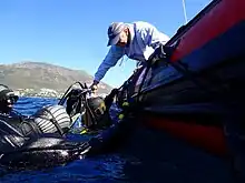 Getting out onto a beach is unusual in Cape Town, but relatively straightforward. It is usually safer and more convenient to get off on the low side if the boat tilts when running up the beach. If you are on the high side, wait until there is space and move to the low side, or in some cases the high side will become the low side as the boat flops back as the load is removed. Don’t try to unload kit over the high side, in case you are in the wrong place and the boat rolls down on top of you. This is particularly likely if the boat is not fully clear of the waves.