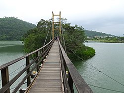 - ๐ Meihua Lake (ๆข ่ฑๆน). A suspension bridge connects an island in the middle of the lake to the walking trail through the surrounding area.