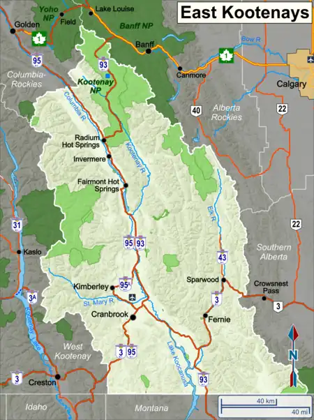 The East Kootenays is a region in south-eastern British Columbia, Canada, generally taken to include the valley of the Columbia and Kootenay Rivers south of Golden to the U.S. border. The valley sits between the Rocky Mountains to the east and the Purcell Mountains to the west. About 60,000 people live in the region (2016).