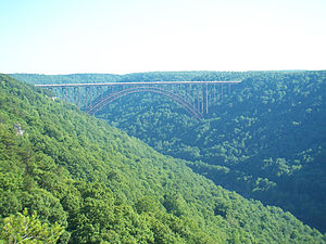 - New River Gorge Bridge, route 19 north of Fayetteville, +1 304 574-2115. Visitors' center open daily from 9AM-5PM. Completed in 1977, the New River Gorge Bridge was the longest steel-arch bridge in the world until the construction of the Lupu Bridge in Shanghai in 2003. Every third Saturday in October, the bridge is home to Bridge Day, when the bridge is opened to pedestrians for great views, organized walks, parachuting and rappelling demonstrations to the river 876 feet below, music, and a variety of vendors. There are beautiful views from a distance of the bridge spanning the gorge; the Canyon Rim Visitors' Center just north of the bridge features an exhibit room, gift shop and a boardwalk with two observation decks.