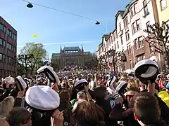 - Walpurgis Night (vappuaatto, valborgsmässoafton) and May Day (vappu, första maj, the Finnish word often written with capital-W), originally a pagan tradition that coincides with a modern workers' celebration, has become a truly giant festival for university students, who wear their colourful signature overalls, white student caps, and roam the streets. Also the graduates use their white student caps between 18:00 at April 30 until the end of May 1st. Student choirs welcome the spring with free outdoor concerts (with a mingling audience). The latter day people gather to nurse their hangovers at open-air picnics, even if it's raining sleet! Definitely a fun celebration to witness as the students come up with most peculiar ways to celebrate. On 1 May there are also parades and talks arranged by the left-wing parties, and families go out buying balloons, whistles and other market fare. Small towns often arrange an open-air market or an event at a community centre, open to the public.
