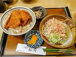 While most of Japan prefers to eat its katsudon (breaded pork cutlet on top of rice) topped with a sweet omelet, Fukui is famous for creating the sauce katsudon, which is instead covered by a sweet and salty sauce similar to Worcester sauce. It is ubiquitous on menus throughout the prefecture. Another famous local food is oroshi soba, cold or hot buckwheat noodles with grated Japanese radish. Restaurants serving oroshi soba can be found throughout the prefecture.