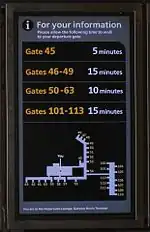 Check at your airline check-in counter beforehand for how long it takes to get to your gate if then known. Later, check any of the many, often-updated departure boards to see when your gate is announced; they don't announce gate assignments over speakers.