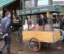 - π Cuberdons sold by street vendors, Kortemunt, near Groentenmarkt. Every day in Korte Munt near Groentenmarkt, two street vendors are selling cuberdons or Gentse neuzen (Ghent nose). These candies are purple cone shaped gum Arabic sweets with a raspberry centre. If you stop, you will shop because these vendors are experts at promoting this Ghent specialty, so much so that they infamously got into a small fist-fight due to them competing for customers. One of the vendors also sells the pastries of the adjacent bakery 'Himschoot's'.