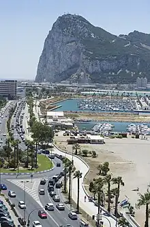 The bus station in Algeciras is opposite the railway station and to get there from the harbour, turn left, walk along the main street for about 100 m and then turn right. Continue about 200 m along this street to the small building with railways. There is a small sign for the bus stop. This bus can get you to La Línea for €2.35 (January 2013), and it goes every 30 minutes during the day. Some buses run non-stop while others make intermediate calls. In La Línea you will arrive at the bus station about 500 m from the border with Gibraltar. In the summer it can take up to 2 hours to cross the border with a car.