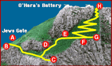 - 🌍 The Mediterranean Steps. For those not afraid of climbing up steps cut out of rock, and with a head for heights, this is a hefty hike that starts at Jew's Gate bird observatory on the south end of Gibraltar, Queen's Road near Engineer Road and winds its way up the east side cliff face of the Rock to the summit: the views are fantastic. If you don't fancy the uphill struggle, you can always get the cable car up and then come down this way, although if trying to reach the steps from the cable car there are no signs posted on how to reach them until one has found the beginning of the steps. Make your way to the ape den, continue walking, then take the left (uphill) turn toward the military O'Hare's battery. The steps begin and end here.