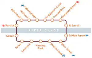 It's described as an inner and outer circle but that just means the direction of travel, with the outer circle running clockwise. Going anti-clockwise on the inner circle, the Subway runs from the city centre to West End and Glasgow University, south under the Clyde to Ibrox Stadium then back into the city, with each orbit taking 24 min. Use St Enoch for Central and Argyle St stations, and Buchanan St for the bus station and Queen Street station. No bikes are carried, and wheeled access to platforms is limited.