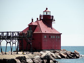 The channel light guides watercraft from Lake Michigan into the Sturgeon Bay Ship Canal, Door County, Wisconsin.