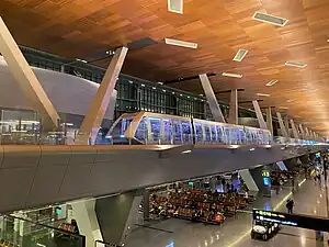 The Red Line of the Doha Metro serves the airport at the "Hamad International Airport T1" station. Because the line to the airport is separate from the main line, some trains will go to the airport while others will go to the southern terminus of Al Wakra instead, so check the destination signage. In addition, this means that trains running northbound from Al Wakra will not stop at the airport, so a transfer is needed to an airport train at Oqba Ibn Naife or others stations to the north.