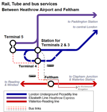 - South Western Railway (bus link from Terminals 2 & 3, bus 285, and Terminals 4 & 5, bus 490, to Feltham railway station.). Trains every 20 minutes. Although a slower route, if you are heading for south London or the west London suburbs, Richmond or Windsor, this could prove a useful shortcut. Regular bus services run from the airport to Feltham station (single fare £1.30 on Oyster) and a frequent east-west rail line runs between Reading and London Waterloo (single fare £5). Depending on the route, some trains take 30 minutes (trains via Richmond), others take 45 minutes (trains via Hounslow and Kew), so it is advised to check the train times carefully if you are rushing to catch a plane. You must buy your train ticket before boarding as this is not an airport express train but a standard suburban rail service. You can use Oyster cards valid for zone 6 to use the train and bus on this route.