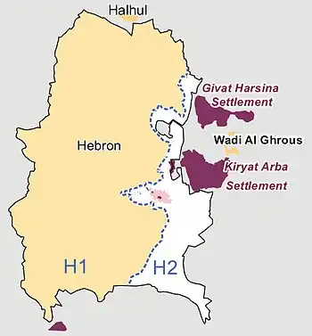 Today, the city of Hebron is home to about 500 Jews and 200,000 Palestinians. The Jewish settlement of Kiryat Arba (population 8,000) is a separate city immediately adjacent to Hebron. Hebron is divided into two sectors: H1 is entirely Palestinian and includes about 80% of the city's residents, while H2 contains all the Jews and the remainder of the Arabs. H1 is under full Palestinian control (i.e. Area A), while H2 is under full Israel control. The Cave of the Patriarchs, the main holy site in the city, is on the border between H1 and H2.