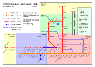 All public transport within the Capital Region is coordinated by HSL, which is divided into four zones. Here's a rough description of the zones: