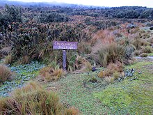 🌍 La Virgen at about 4200 m ASL is the highest point reachable by car. It's about 10 km away from Chaupi but given the condition of the road, expect the drive to take an hour. Here you'll find a parking lot and some signs, it's the official entrance to the natural reserve but there's no other infrastructure like a kiosk or park office. You can camp here, though, and there's water in a stream. From here it's a three-hour walk to the Nuevos Horizontes hut (see Sleep below). First the path goes through a swampy landscsape with small trees and shrubs, then the landscape turns more volcanic.