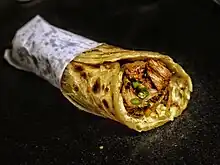 - Kati roll – a wrap invented in Kolkata which is made with a flaky and white flour version of paratha bread and filled with meat, egg or paneer along with onions, chutney and a squeeze of lime juice. The name derives from the Bengali word for bamboo stick of skewer, on which the kebab meat was traditionally cooked.