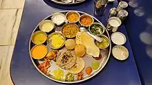 A thali includes a serving of rice, flatbread or both, dal, vegetables and an assortment of curries. This is usually accompanied by papadums, raita or yogurt, chutneys and pickles. Thalis may also include desserts which are served in different bowls or compartments. In restaurants, you can order thalis based on region (e.g. Punjabi or Bengali thali) or by type of food served (vegetarian, seafood, etc.).
