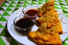 - Samosa – a savoury, tetrahedral or triangular pastry filled with potatoes, peas and onions. Minced meat samosas are also popular, especially outside India. Coming in a variety of sizes, samosas are generally served in a chaat form form immersed in chickpea curry, or with tamarind and mint chutney.