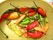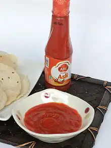 Chillies (cabe or lombok) are made into a vast variety of sauces and dips known as sambal and saus sambal. The word sambal is a loan word from the Javanese and Sundanese sambel. The simplest and perhaps most common is sambal ulek (also spelled oelek), which is just chillies and salt with perhaps a dash of lime ground together using a mortar and pestle. There are many other kinds of sambal like sambal pecel (with ground peanuts), sambal terasi (with dried shrimp paste), sambal tumpeng, sambal mangga (with mango strips), sambal hijau (using green chilli), sambal bajak (fried, usually with tomatoes), etc. Many of these can be very spicy indeed, so be careful if you're asked whether you would like your dish pedas (spicy). There may be a bottle of something that looks like ketchup on your table: this is Sambal ABC (ah-beh-cheh), one of the brands of saus sambal, a fiery garlic and chilli sauce, or one of its many imitators (the real thing is branded Asli, "Original"). Many Indonesians also eat raw chili cabe rawit when they eat salty fritters.
