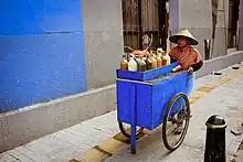 There are travelling vendors who carry a basket of pre-prepared food (usually women), or who carry two small wooden cabinets on a bamboo stick (usually men), who may serve light snacks or even simple meals, some of which are very cheap and enjoyable. Other travelling vendors use pedaled rickshaws and pushed food carts.