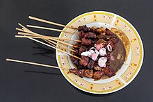 - Sate. (satay), grilled chicken, beef, goat or, rarely, pork, lamb, horse, or rabbit on a skewer and served with sauce (several varieties, but peanut sauce is most common). The vegetarian version of satay is also common in Indonesia like sate jamur (oyster mushroom satay) and sate kere from gembus (Javanese tofu dregs). Originally from Javanese cuisine, but has been adapted into many variants throughout the archipelago, as well as in neighbouring Malaysia and Singapore.