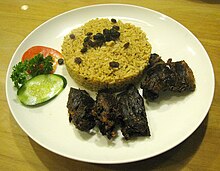 - Nasi kuning. , yellow spiced rice; popular at breakfast, the festive ceremonial dish version is moulded into a sharp cone called a tumpeng.