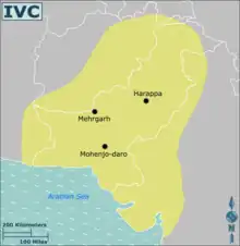 The Indus Valley Civilisation (abbreviated IVC), also known as the Harappan Civilisation, was a Bronze Age civilisation which flourished from 3300 BCE to 1300 BCE. Over 1400 archaeological sites have been identified as belonging to this civilisation, predominantly in central and eastern Pakistan and northwestern India; Wikipedia has a list.