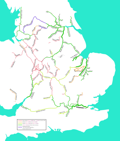 The modern network in England consists of a series of linked waterways (both river and canal), some isolate navigable rivers and the Norfolk Broads.