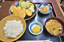 Most Japanese meals consist of a main course with rice, miso soup, and side dishes. When served in restaurants, this is a teishoku (定食, "set meal"); when served as take-away, it's an o-bentō (お弁当).
