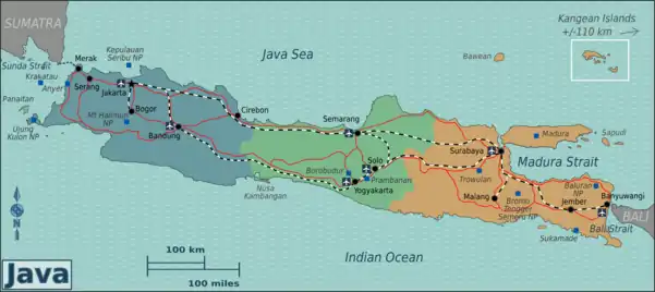 Java (Indonesian: Jawa) is an island in Indonesia. The much smaller but still sizable island of Madura, off the coast of and covered as part of the region of East Java, is also included in this article.