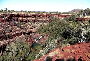 The north edge of the range is a scarp eroded by streams into deep gorges and canyons, with a red banded appearance from the dolomite. The gorges broaden and their outwash fans out across the Fortescue valley. This creates a grand scenery of seasonal waterfalls and pools, with the ever-changing light playing on the coloured rock layers. In a wetter climate such old mountains would have eroded away, but this has long been a tropical semi-desert.