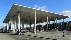 The 🌍 Busbahnhof Kassel Wilhelmshöhe (intercity bus station), also known as the ZOB, adjoins the Kassel-Wilhemshöhe Bahnhof. There is another intercity bus station at 🌍 Kaufungen-Papierfabrik, a few meters behind the city boundary of Kassel at the motorway. The tramlines 4 and 8 are running from the Papierfabrik in the city centre.
