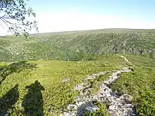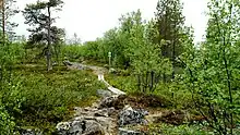 - 🌍 Sulaoja spring (Sámi: Suttesgáldu, Finnish: Sulaojan lähde) and 🌍 Luomusjärvet lakes (Sámi: Luopmošjávrrit) are on the trail but located in the Paistunturit Wilderness Area. The lake Luomusjärvi is divided into two parts by a narrow but high esker. The trail follows the ridge of the esker. Enjoy the views.