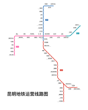 Line 6 from the airport to downtown was the first line to go into service, followed by Line 1 and Line 2, which temporarily combined as one line run from south to north through the city center and via Kunming Railway Station. Line 3 is an east–west line connecting to Line 6. Line 4 is a south–north line starting from the new Kunming South Railway Station.