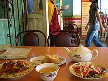 Kyrgyz food is the product of a long history of pastoral nomadism and is overwhelmingly meat-based, which means that virtually all of the traditional dishes contain meat. If you are vegetarian you can, however, ask for vegetarian food and in many cases will receive a tasty vegetarian meal without much hassle, or you can purchase your own fresh fruit, vegetables and fresh bread from one of the many small stands or food bazaars that are ubiquitous in every city. While some people from the West think of large vegetables as desirable, small and flavourful is the rule. The same approach is valid for pistachios and almonds as well. Washing vegetables before consumption is recommended.