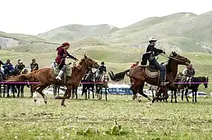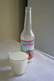 Summer sees yurts lining the main street selling kumys (Кумыс), fermented mares milk. Ladled out of barrels brought down from the mountains, this traditional drink is one of more difficult to get used to. It has a very strong and pungent foretaste and a smoky finish. Kumys starts off as fresh horses milk (known as samal), the samal is then mixed with a starter made from last year's kumys and heated in a pot. The mixture is brought to just before boiling and then poured into a horse's stomach to ferment for a period. A local grass called 'chi' is then roasted over a fire and cut into small pieces. Once the milk is finished fermenting, the roasted chi and milk are mixed in a barrel and will keep for the summer if kept cool.