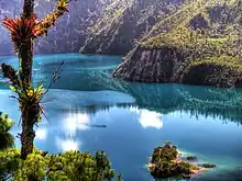 Lagunas de Montebello National Park is in Chiapas in the southern part of Mexico, near the border with Guatemala. It is famous for its many colorful lakes (CONANP says more than 60, some other sources say 59). The lakes are remarkable for the wide range of natural water colors they exhibit; colors that range from light aquamarine to a brilliant deep purple. Some lakes are green, others blue, a few red. The park is a designated UNESCO Biosphere Reserve.