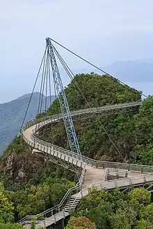 - 🌍 Panorama Langkawi: SkyCab Cable Car Ride & Sky Bridge (in Oriental village, close to Pantai Kok), ☏ +60 4 959 4225, [email protected]. Daily 9:30AM-7PM. Ride the cable car to the top of the jungle-clad Mt. Machincang and walk across the 700m high Sky Bridge for a spectacular view of the islands and Thailand. During peak times you may have to queue for up to 2 hours. At 125 m long, it is the world’s longest curved suspension bridge. Opened in 2003. The SkyBridge is at the top station of the cable car which can be reached using an elevator/cabin on a track (SkyGlide, RM15 for foreigners) or through a small forest trail (RM5 for foreigners), the trail is only around a 10-minute walk but involves a lot of stairs. The first cable car drop point (the mountain furthest east) can be walked to as well. You follow a path that takes you under the cable cars. Includes a very steep section which is spectacular both going up and coming down. Doesn't operate in bad weather. Also, it doesn't run during the regular maintenance days, check before you go. Officially you are not allowed to take food and drink on the cable car, but they seem not to be checking backpacks (when unlucky and all your water is taken by the security, you can buy one at the top). If they are not operating, or you are really into hiking, you can trek partway up the mountain through the jungle. To do this, from the parking lot at Telagah Tujuh Waterfalls go left just before the road goes really uphill and then turn left again at the water reservoir. The trek is very steep most of the way and in a pretty bad condition because the contractors laying down the piping for cables littered garbage all the way to the top. Only attempt this if you are fit and have good hiking boots. Temperatures at the top of the mountain are 4-5 ⁰C lower than at sea level. Cable car+Skybridge RM43 Adult, RM33 child (Malaysians) RM85 adult, RM65 child for foreigners.
