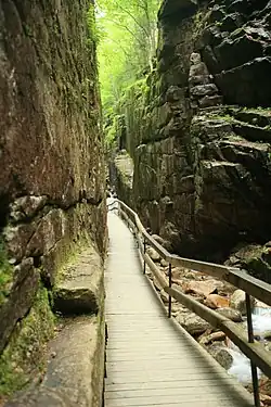 - π Flume Gorge, Rt 3, β +1 603 745-8391. The Flume Gorge offers a 2-mile self-guided scenic walk through an 800 foot natural chasm that is situated beneath Mount Liberty. The trail passes over covered bridges and past waterfalls, a scenic pool and mountain views. There is an information center, cafeteria, and gift shop for people to visit to learn more about the Gorge. Though the trails have railings, it is advisable to wear shoes that can hold traction on potentially slippery surfaces. Adults (ages 13+) $14, children (6-12) $11, children ages 5 and under are free (with paid adult).