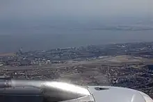Central Lisbon seen from a plane landing at Portela, looking south; the green strip is Parque Eduardo VII terminating at Praça Marquês de Pombal.