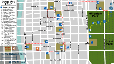 You won't need to bring much else besides this article. If you are planning on doing the full itinerary, be sure to wear comfortable shoes. In total, it's a 2.7 mile-walk (4.3 km), and that doesn't include time spent indoors. Inclement weather will make the walk less enjoyable, but only a real storm or the most frigid weather would really stop you from making the journey. Check the weather before you head out and bring rain/snow gear as appropriate. Don't forget your camera and consider bringing along the Wikivoyage map of the Loop, in case you want to stop in a cafe or finish with a beer.