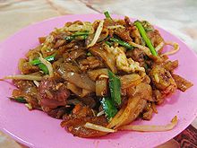 • Char kway teow (炒粿條) is a favourite noodle type in Penang and Singapore. Some flat rice noodle fried with soya source, prawn, cockles, bean sprouts, chives & bak you (lard), though this last ingredient is sometimes absent due to the popularity & demand of this dish from the Malays & Indian Muslims who traditionally shun pork. It is typically salty in Penang, but a little sweet in Singapore due to the addition of sweet soy sauce.