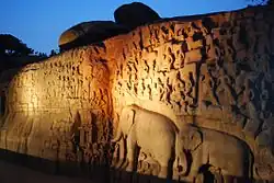 - 🌍 Arjuna's Penance (Descent of the Ganges). A giant bas-relief filled with detailed carvings, including a family of elephants and monkeys. Archaeologists still squabble over what, exactly, the bas relief depicts; the central figure may actually depict Bhagiratha, not Arjuna.
