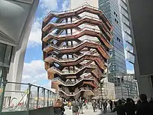 - π Vessel, 20 Hudson Yards (in Hudson Yards area; Subway: 7 to 34 StβHudson Yards), β +1 332-204-8500, [email protected]. 10AMβ9PM, daily. Re-opened in October 2024 with steel-mesh safety nets and an unusual rule: No solo visitors. Plan to bring a friend when you visit this 16-story honeycomb-like structure at the core of the new Hudson Yards development project on Manhattan's West Side. Its 154 flights of stairs and 80 landings offer great views of the surrounding area, the Hudson River, and the structure's intricate framework. Buy admission tickets online in advance. Elevator service is available to three floors, usually with a long wait. No baby strollers, bicycles, skateboards, food, pets, or emotional support animals. $10β15.