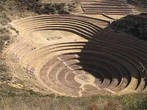 - The Agricultural Laboratory of the Incas - Three large natural depressions in which terraced co-centric circles were constructed. Seeds cultivated at this site were likely sent throughout the Incan empire to improve yield in the harsh conditions of the Andes and were probably one of the benefits offered by the Incas for peaceful incorporation of neighboring tribes into the Incan empire. Today the site is a series of co-centric circles on plateaus 400 m above the valley floor (3,200-3,500 m above sea level). The site was designed by the Incas to take advantage of natural depressions below the level plain and model Andean, jungle and semi-tropical environments for the growth of different plant varieties. Pollen studies indicate that soils from each of these regions was imported by the Incas to each of the large circular basins. In the largest of the depressions (150 m) a series of water channels can be seen finding their way to the bottom. Studies have found temperature variations up to 5 degrees Celsius.
