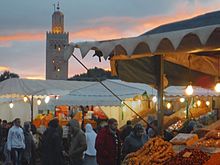 • 🌍 Djemaa El-Fna. The highlight of any Marrakech night. Musicians, dancers, and story tellers pack this square at the heart of the medina, filling it with a cacophony of drum beats and excited shouts. Scores of stalls sell a wide array of Moroccan fare (see the Eat section) and you will almost certainly be accosted by women wanting to give you a henna tattoo. Enjoy the various shows, but be prepared to give some dirham to watch or take photos. By day it is largely filled with snake charmers and people with monkeys, as well as some of the more common stalls.