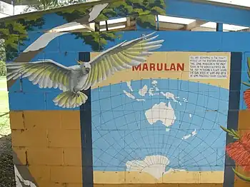 The toilet block in Marulan is painted with a mural symbolising the town's placement on the 150ΒΊ meridian.