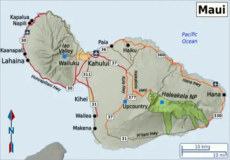 - π Wailuku β the seat of the county government, home to several historic buildings listed on both state and gateway to the Iao Needle.