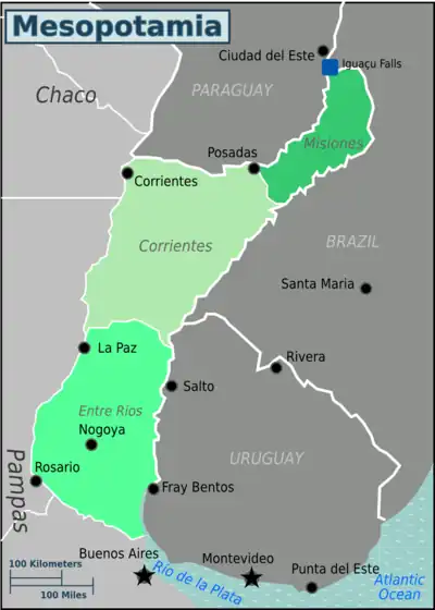 Mesopotamia is a region in the northeast of Argentina bordered to the north by Paraguay, to the east by Brazil and Uruguay, to the south and west by the Pampas region, and in the northwest by the Chaco region.